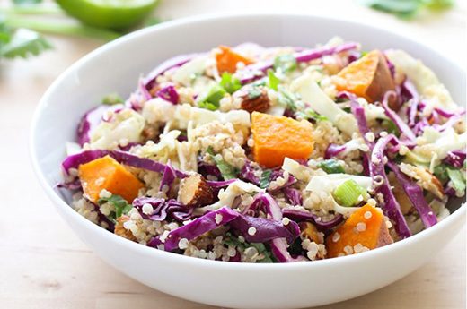 Ingredients 3 cups diced sweet potatoes 1 tbsp oil 3 cups quinoa (cooked) 3 cups green cabbage , shredded 3 cups shredded red cabbage 1/2 cup green onions , diced...